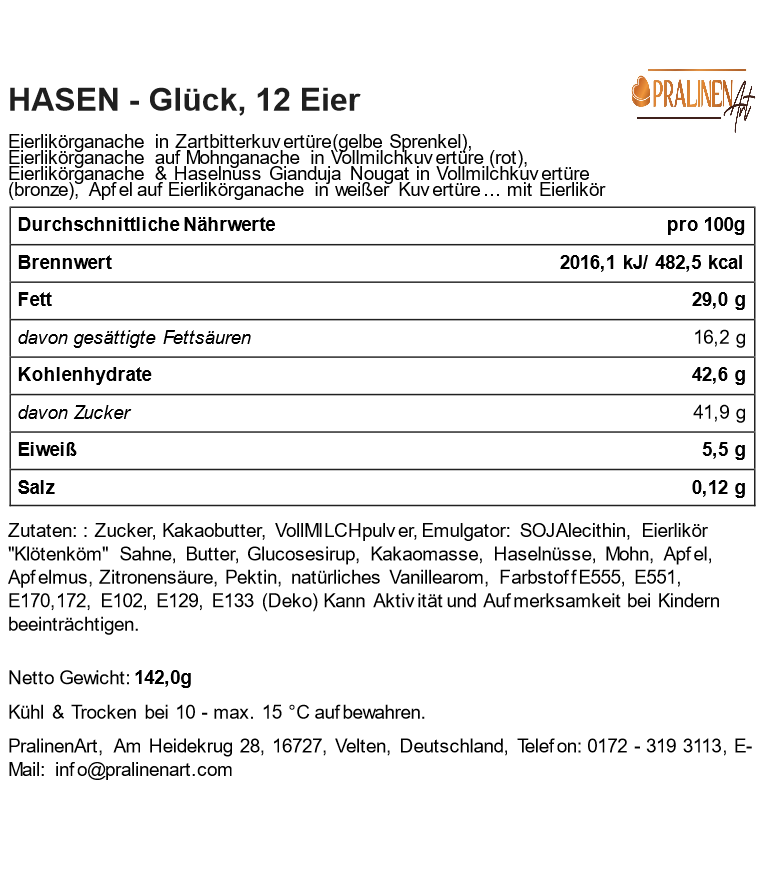 Enthält Hochwertigen Eierlikör von BrinkmannFinest Inhalt: 12 handgefertigte Pralinen Netto-Gewicht: 137 Gramm