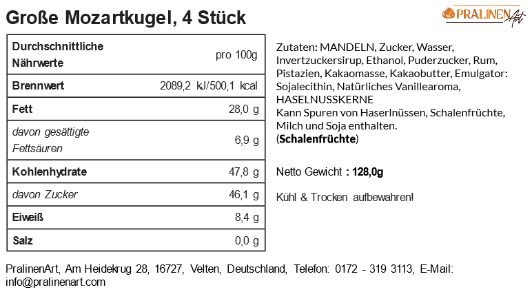 Inhalt 4 handgefertigte große Mozartkugeln