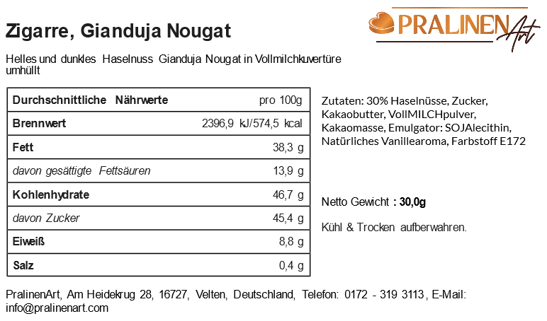 Diese Nougat Zigarre ist zweischichtig mit dem wohl leckersten und edelsten Nougat aus (von mir) schonend gerösteten Piemonter Haselnüssen gefüllt. Nicht nur Nougat-Fans erleben hier echten Genuss. Der wohl häufigste Kommentar meiner Kunden ist ein kurzes und inniges "WOW!"
