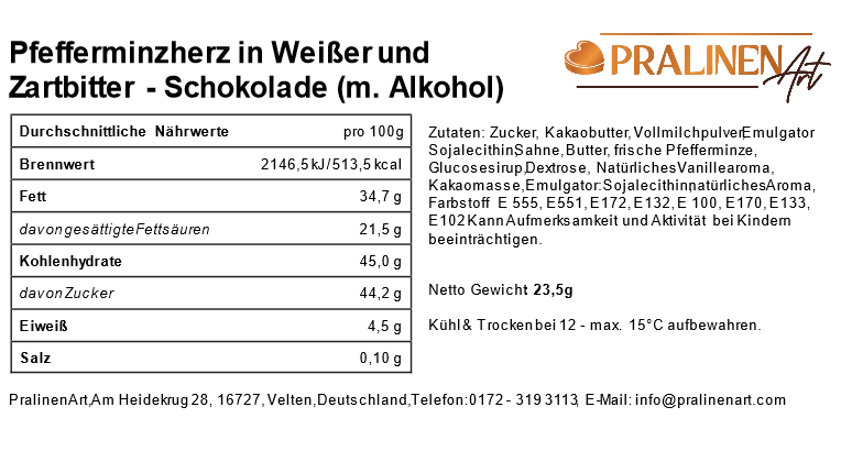 Eine feine Schicht aus Zartbitterschokolade ergänzt die Frische der Minze um eine leicht herbe Note, die dem gefüllten Schokoladenherz eine besondere Tiefe verleiht.